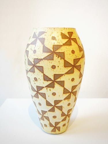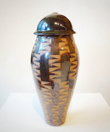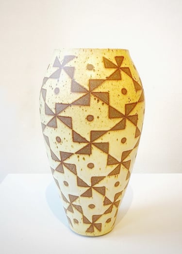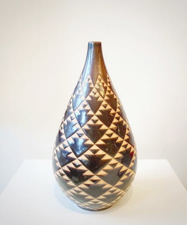 “As an artist, my creative process is continually influenced by Far East Asian cultures, as well as, the poignant history of the Pink Triangle. I refer to my art practice as ‘awakening clay.’ Prior to the final glaze firing, I carefully apply a handcrafted custom pattern to the surface of each piece. I am intrigued by how the nature of pattern wakes up the form of the piece. Attempting to transform triangular shapes on clay into something beautiful is my joy.”